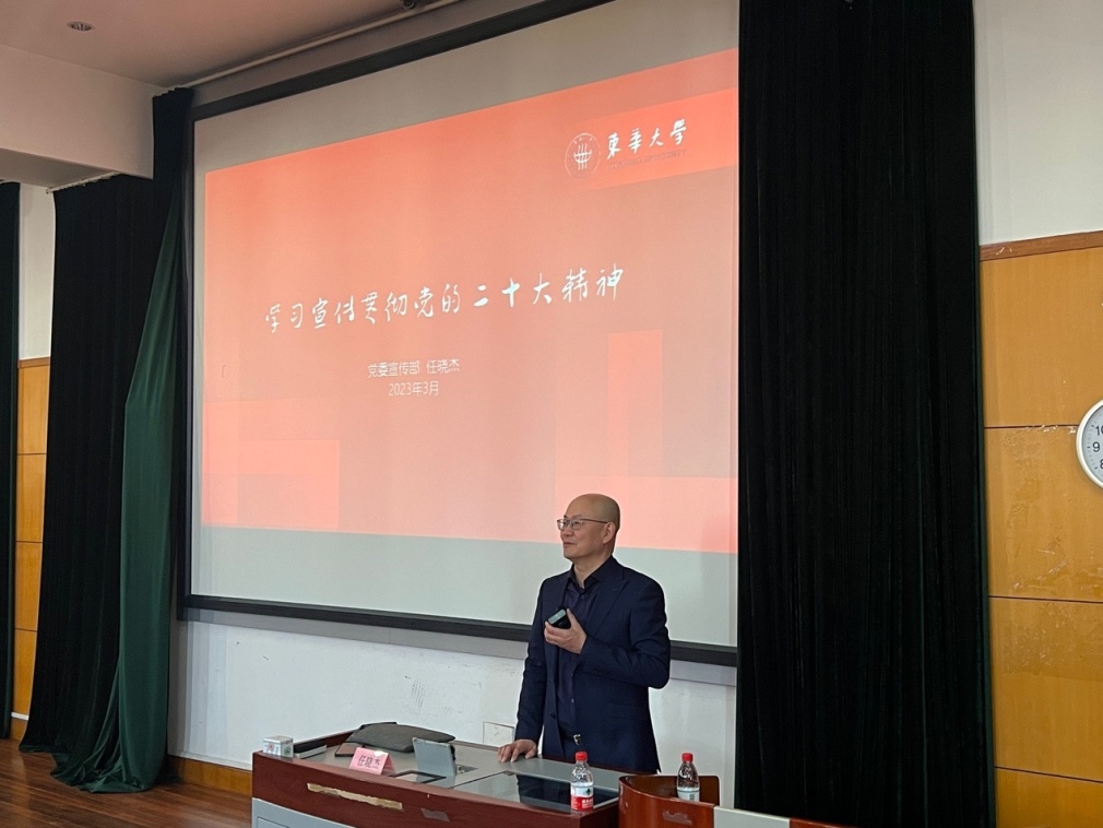 任晓杰首先阐述了党的二十大报告的逻辑要点和整体结构,他强调二十大报告是是中国共产党团结带领全国各族人民夺取新时代中国特色社会主义新胜利的政治宣言和行动纲领,是一篇马克思主义的纲领性文献,指出要高度重视对二十大报告的学习领悟。他详细讲述了过去五年和新时代10年的伟大变革以及从现在起党的中心任务,着重分析了科教兴国战略、我国高等教育所取得的成就,以及学校、学院发展的机遇和优势。他提出要从三个方面贯彻落实党的二十大精神,一是坚持和加强党的全面领导,二是认真落实立德树人根本任务,三是推动学校实现高质量发展。
