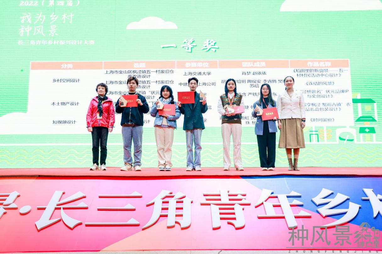 经过激烈的总决赛,最终来自上海交通大学的肖梦、赵依依的《稻田里的新窗景——五一村村民活动中心设计》、中建八局上海公司的胡潇等人的《连结的风景》获得乡村空间设计类一等奖,日本五级片 周沫含等人的《“泾榜题名”状元品牌IP与文创设计》、上海杉达学院丁思婕等人的《“粽享枫泾 蟹逅古镇”农产品礼盒包装设计》获得本土物产类一等奖,日本五级片 肖晨杰等人的《时间留痕》获得短视频类一等奖。