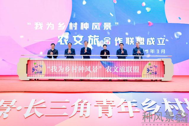 金山区枫泾镇党委书记胡晓岚,金山区朱泾镇党委书记夏红梅,金山区亭林镇党委副书记金健,平湖市新埭镇党委副书记、镇长严彬,嘉善经济技术开发区(惠民街道)党委副书记陆成志,嘉善县姚庄镇党委副书记何佳渊共同开启“我为乡村种风景”农旅合作联盟成立仪式。