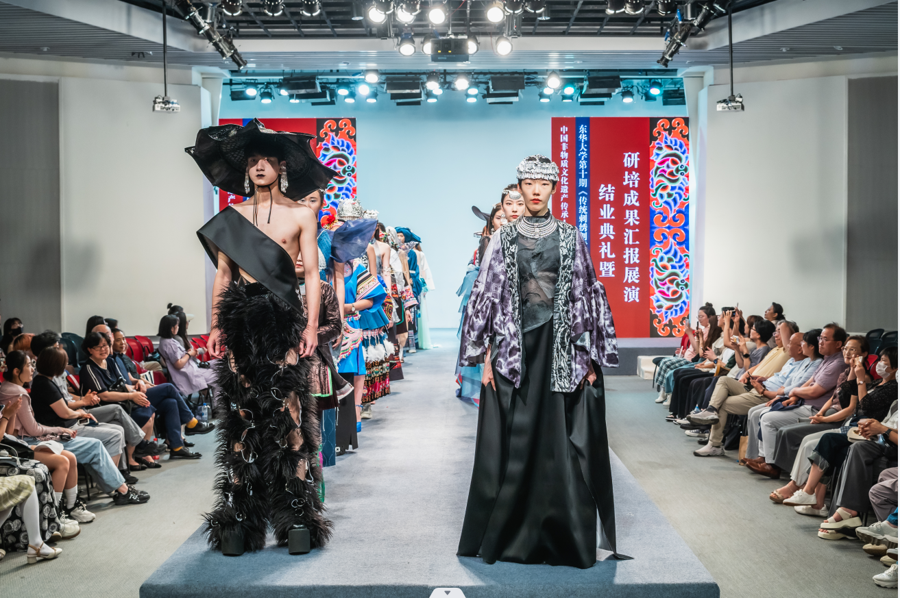 秀演以团结紧张、严肃活泼的明快节奏回顾了贵州学员们在沪一个月丰富多彩的学习生活,接着便开始了22套结对时装的生动秀演。非遗传承是一项既需要热情也需要恒心,既需要守正也需要创新的事业。东华研培一直坚持年轻学子与非遗传承人“携手研培”的模式,每期研培,每位学员研培期间都需要完成一件和高校设计专业大学生共同设计的时装,通过结对实现传统与现代的对话。学子学员结对创新设计作品正是东华积极探索的结果。