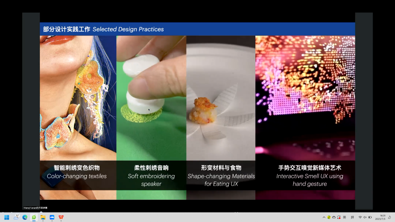 田玉晶副教授为大家介绍了以时尚和创新为主题的产品设计专业方向,并分析了传统高校在设计领域的差异性。针对行业需要、时尚创新、学科交叉融合等特征,强调国际视野、时尚创新、产学研协同创新等机制;同时,还利用产学研合作形式,将学生培养与产业链需求相联系,构建相互共赢平台,实现设计赋能产业的目标。此外,还重点介绍了以乡村振兴和文化传承为主题的课程设置和实践案例,旨在实现设计服务国家和社会的目的。