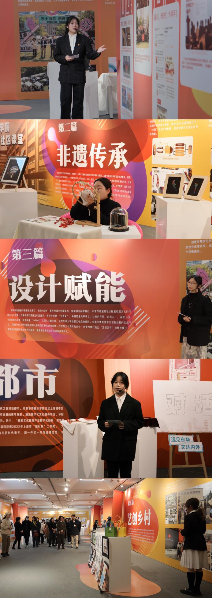 本次展览通过“展”、“演”、“秀”等多元形式,从“逐梦先锋”、“非遗传承”、“设计赋能”、“对话都市”、“艺创乡村”五个篇章,以回顾展现的视角,总结了学院近年来在红色文化、设计文化、传统文化、创意文化、实践文化方面取得的成效,呈现了学院以深入实施“时代新人铸魂工程”为牵引,在实践育人、文化育人、网络育人中实现的学校“小课堂”与社会“大课堂”的双向互动。
