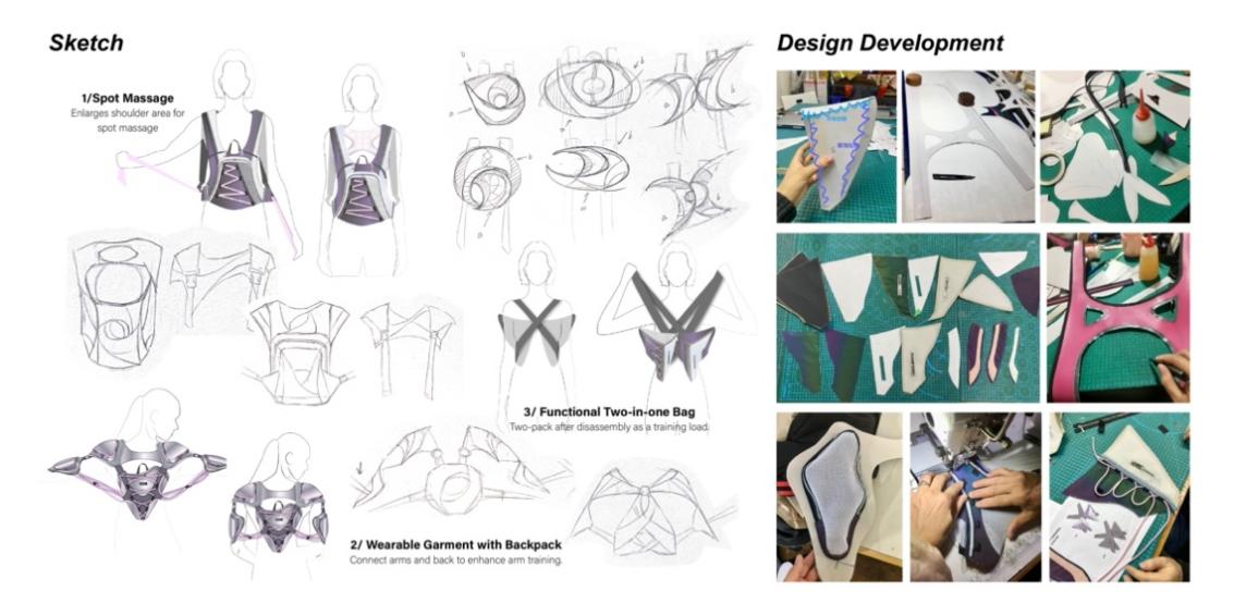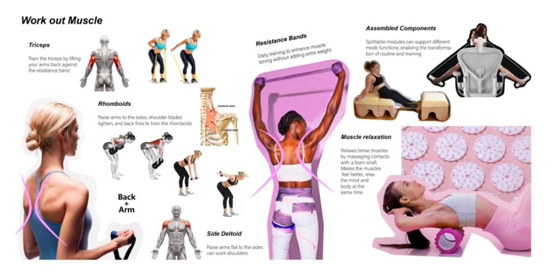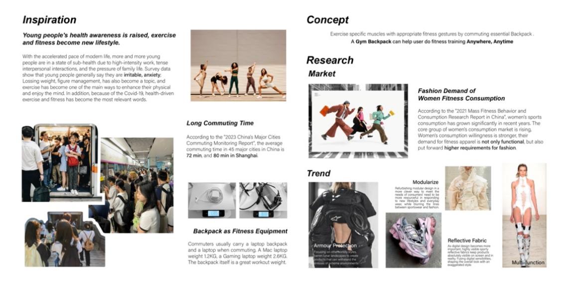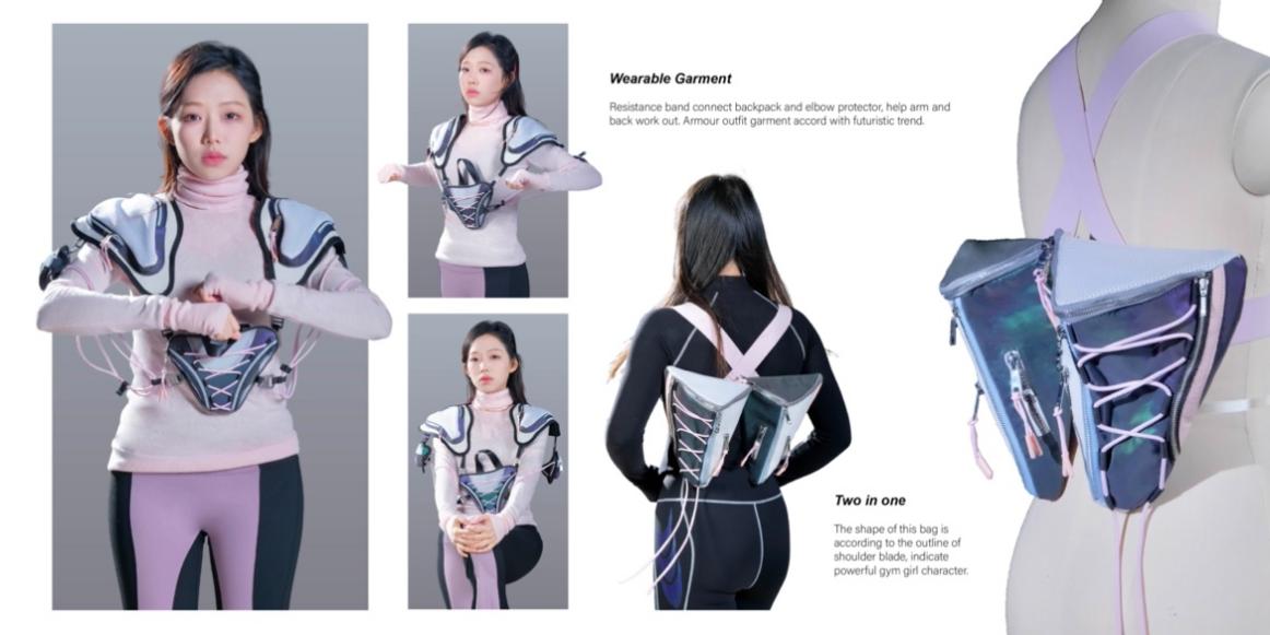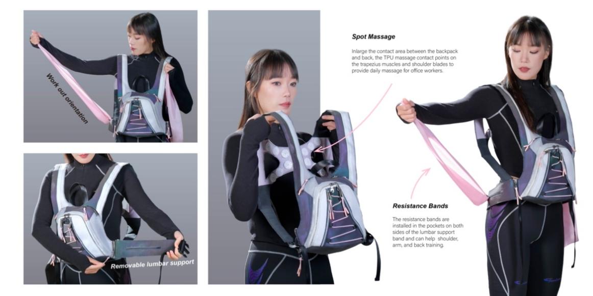 本系列设计概念将日常通勤中人们背负较重的电脑作为健身的配重,在箱包设计中加入弹力带、按摩触点,融入特定健身动作,使运动融入日常生活,响应国家全民健身号召,为人民健康服务,让产品设计更有温度,点亮人们的美好生活。
