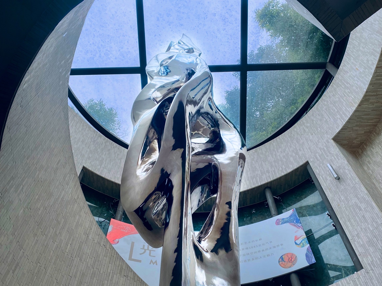 雕塑展品取意龙的形象,献礼2024。形状灵感来源于虫洞穿越的概念,在这个作品中一个又一个的虫洞象征着链接未来和过去、时间和空间的无限可能。在长廊中铺设灯带,灯光与雕塑的动态呼应形成冲破时空、穿梭未来的链接通道,寓意无论我们身处何地、来自何方,时间和空间从未成为束缚我们的桎梏,而是链接我们与未知世界的通道。