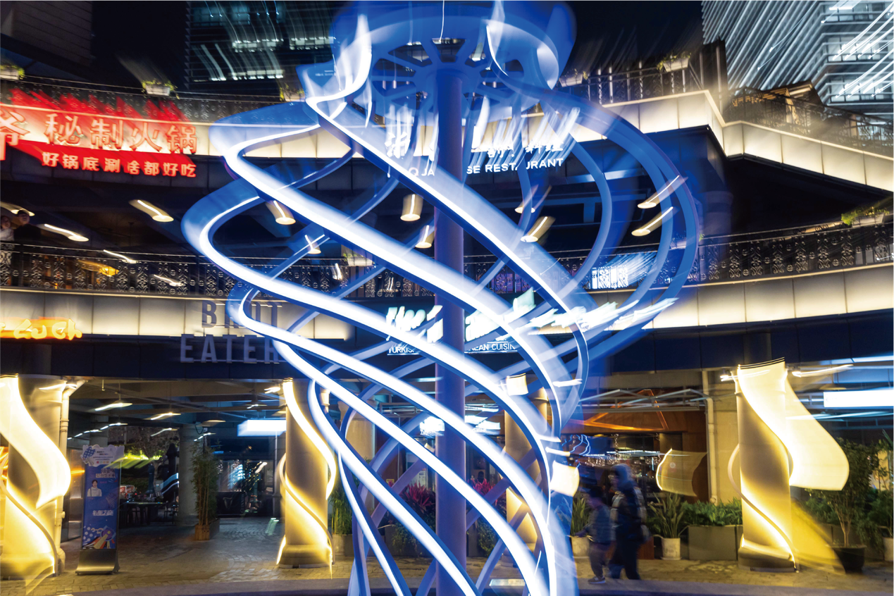 如群龙出水,写意灵动。如万物向上发展,给予观者信心。水池中央与廊柱的灯光随时间而扭转,交相呼应,形成一场极具韵律的共振之舞,时而迅疾如雷霆,时而缓慢如春风。作品以包容的扭转姿态展现着开放的状态,不同颜色在作品中相互链接与交融,致敬海派精神的开放与进步。动态的流转,打造因链接而生的无限活力,每一次共振都是一次奇迹的诞生。