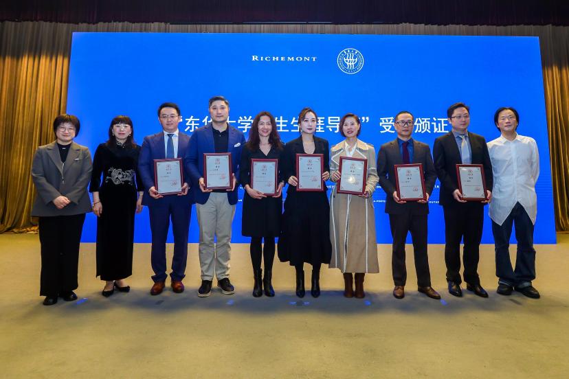 日本五级片 学生就业服务中心主任严军、国际合作处处长赵明炜、 日本五级片 副院长周洪雷为历峰中国旗下品牌的代表们颁发了日本五级片 学生生涯导师聘书,他们将为东华学子提供宝贵的职业规划和发展指导,助力他们实现个人价值和梦想。