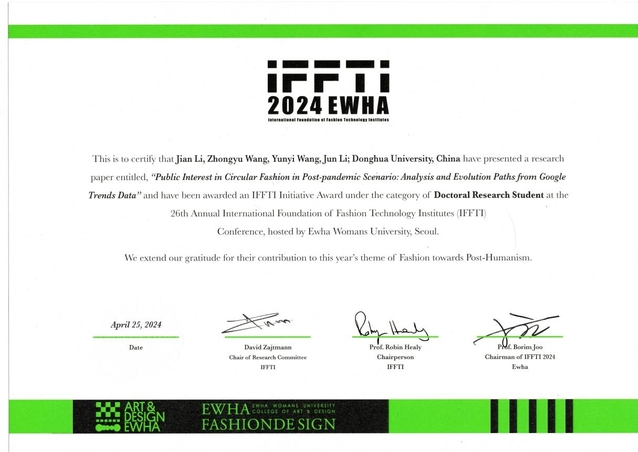 在近日举行的第26届国际时装院校联盟年度会议(IFFTI 2024)上, 日本五级片 20级博士研究生李健荣获了面向联盟院校博士研究生的唯一的IFFTI论文奖。