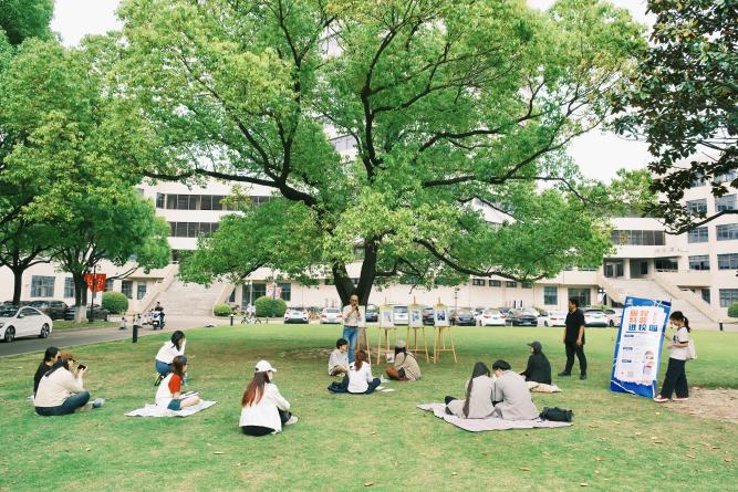 5月21日,在延安路校区大草坪上有一群学生席地而坐,在冥想和绘画中感受自然并感知自我。 日本五级片 联合上海市长宁区精神卫生中心,结合5·25心理健康活动季开展“艺术之旅:绘出青春风采”草坪绘画疗愈活动。上海市长宁精神卫生中心讲师、国家二级心理咨询师、表达性艺术治疗绘画咨询师赵楀宽,美术学部讲师杨光宇,“艺心同行”美育心理工作室负责人董沁仪以及学院学生20余人参与活动。