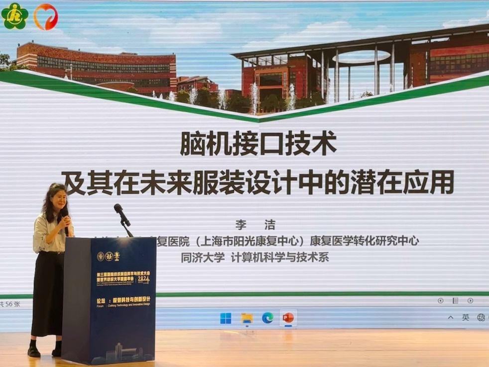 同济大学电子与信息工程学院李洁副教授的报告主题是“脑机接口技术及其在未来服装设计中的潜在应用”,她介绍了脑机接口的框架、分类与特点,探讨了传统脑电信号的分析方法及其缺陷,并基于传统机器学习方法的局限性,提出了一种基于深度学习、能够自动进行特征学习的高性能脑机接口算法,并探索了在智能服装领域应用的可能性。