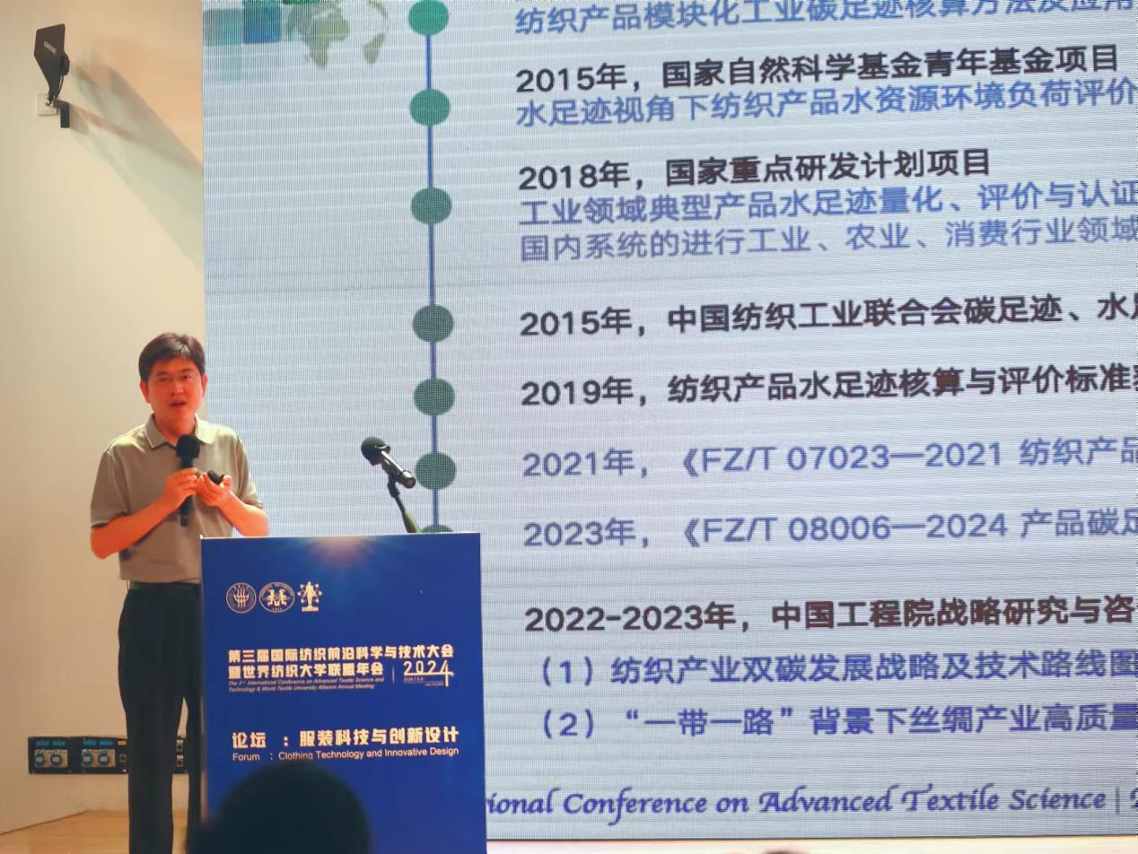 浙江理工大学服装学院王来力教授的报告主题是“服装产品生命周期碳足迹、水足迹量化与评价”,他介绍了量化服装产品与碳、水相关潜在环境影响指标的方案与实施步骤,并对服装产品碳足迹与水足迹核算过程中的关键问题进行了探讨。