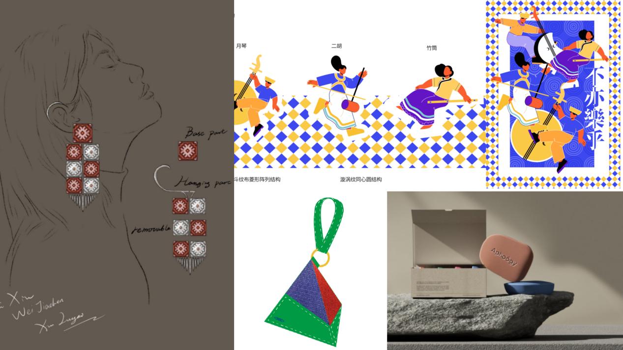 在六枝期间,学院师生还先后走访了落别乡媚娑妮非遗文化发展有限公司、月亮河村阿秀布依族服装加工坊、梭戛乡箐苗服饰民族手工艺坊、牂牁镇情巧布依工坊等非遗传承基地和六枝特区三线博物馆、落别民俗博物馆等。实践团学生根据调研实际,针对文旅发展中的难点堵点,聚焦非遗传承创新的现实需求,结合当地服饰文化、饮食文化等特色,从少数民族IP构建、农特产品包装升级、文创伴手礼设计切入,共创了“不亦(布依)乐乎”“粽享六味”“‘皂’福六枝”等系列作品,以创意设计赋能非能文化传承创新,助力地区文旅产业升级发展。
