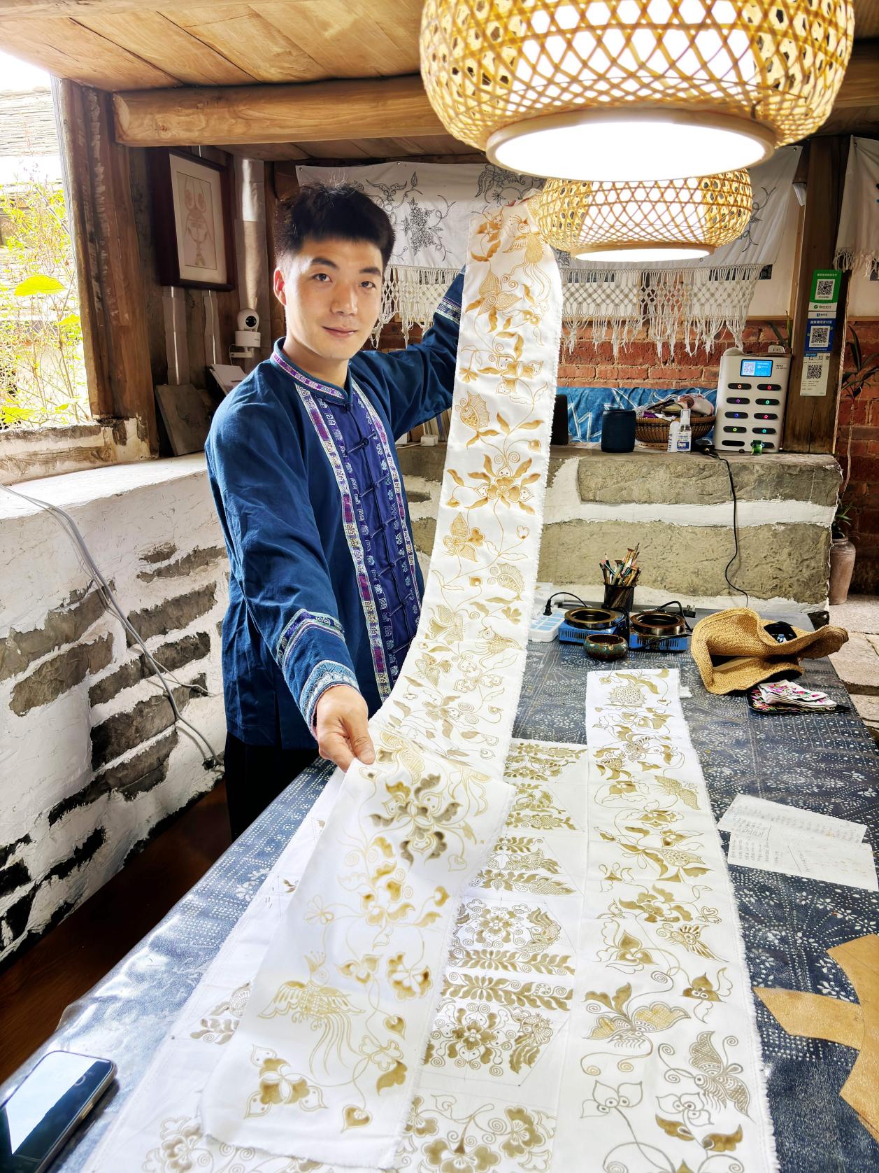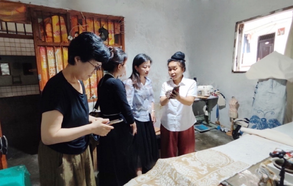 学员杨翱是此次回访给老师们惊喜最大的,他刚完成清华大学校庆伴手礼的订单,又接到了国际名牌的外贸订单,他的非遗工坊是附近高校设计专业学生的毕设实践基地。杨翱兴奋地给老师们描绘了公司的蓝图,未来方向将指向元宇宙服饰及文创设计。
