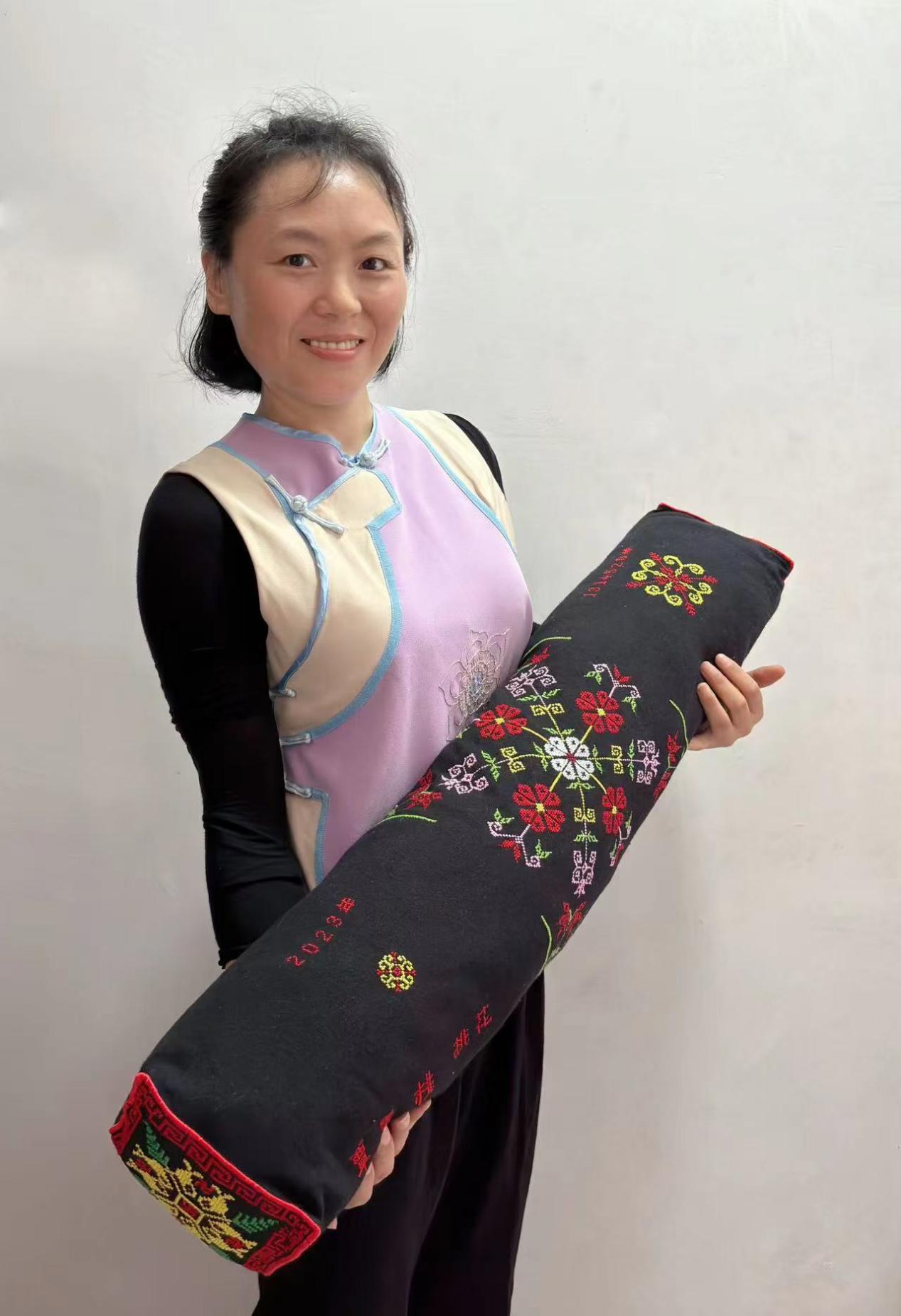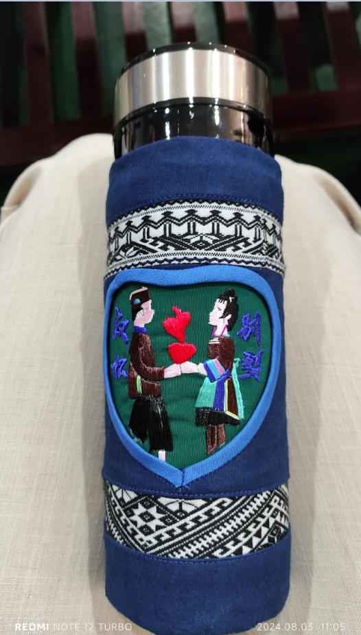 学员王玉英是贵州省孔明苗侗民族绣品服务有限公司的董事长,她以当地流传的民间爱情故事为素材,为老师们精心设计绣制了一副杯套,表达对东华老师的感激之情。