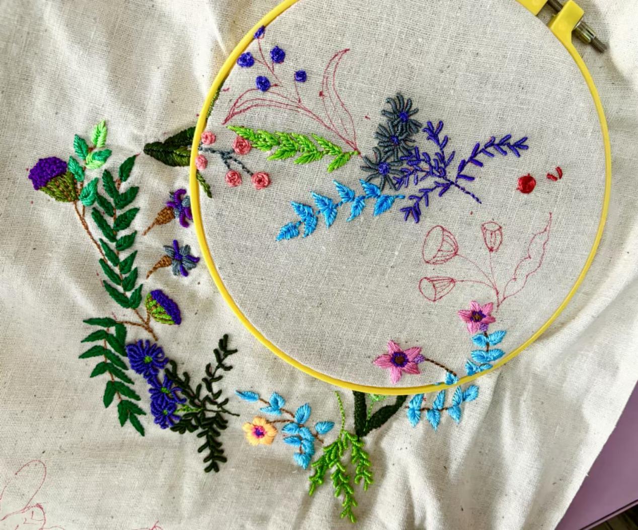 学员文仁会将自己的业余时间都用在了设计和刺绣上,她的不少即兴作品看似稀松平常,选材随意、针法率性,却显得灵动无拘。引起了老师们浓厚的兴趣。