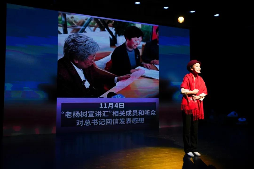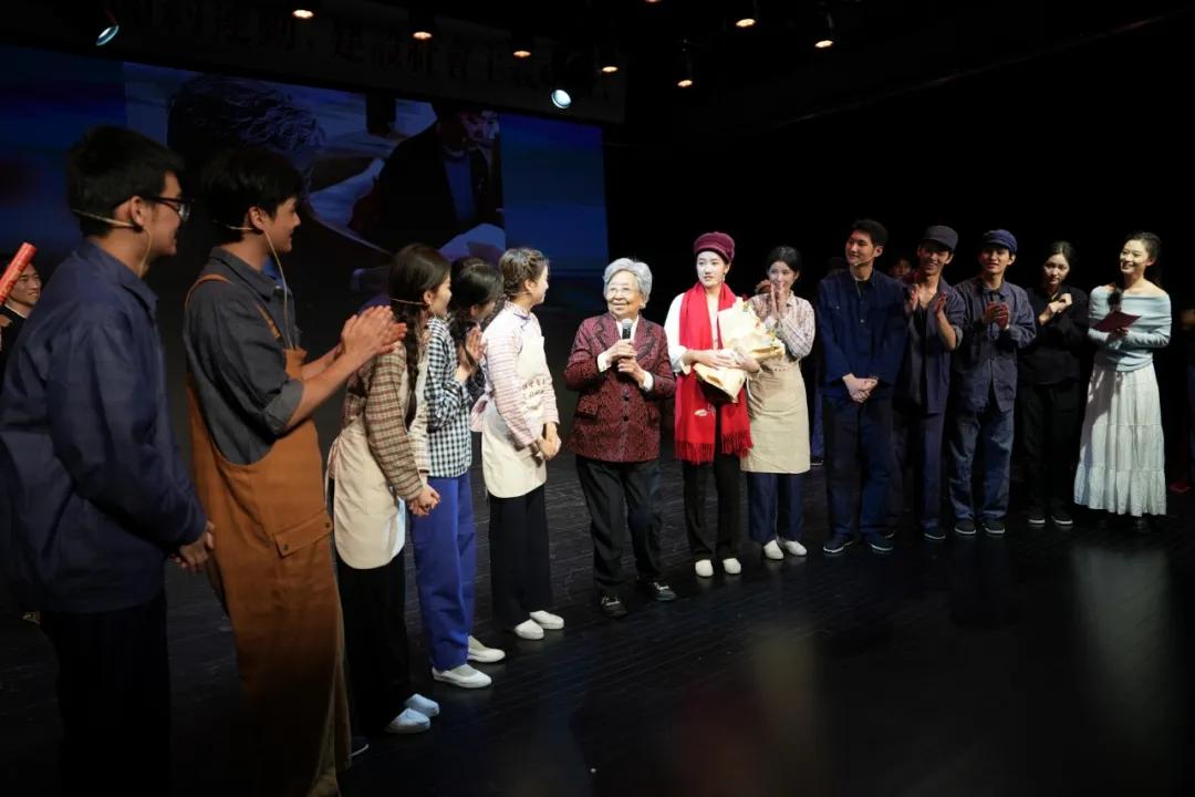 演出结束后,黄宝妹在演员和观众的掌声中登上舞台,她表示很高兴看到大家将自己的故事改编成生动的话剧,同学们的演绎很精彩,感谢学校对这部话剧排演的支持。