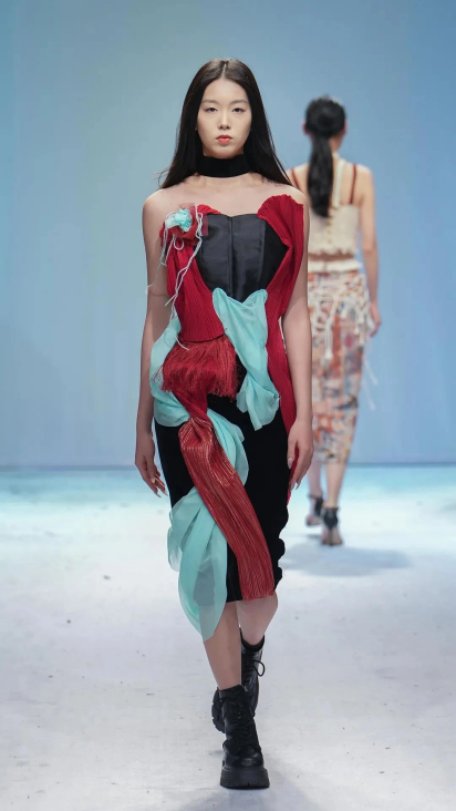 《服装设计造型与方法》课程汇报秀是二年级学生作品的首次登台。本科低年级学生在基础必修课程中对服装设计概念有了初步认识,从实践课程的培养中开始亲手绘制设计草图、将创意转化为实物,并通过多重运用线面构成、仿生、经典解构、闲置再生等设计与工艺手法,表达了大胆的创意和无限的遐想,实现了从创作到制作的转化。这一过程不仅是对学生设计技能的初步锤炼,更是对他们创造力与执行力的一次全面考验。