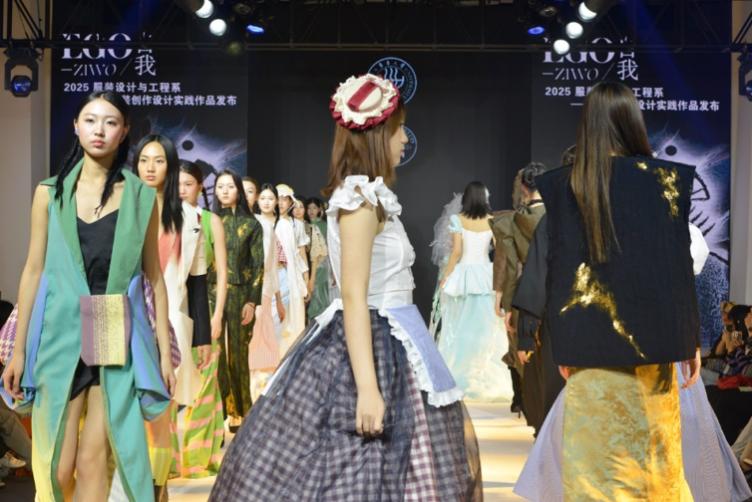 “EGO-自我”2025服装设计与工程系创作设计实践作品发布活动上,43位毕业生的88套作品分“本我・觉醒”“自我・博弈”“超我・升华”三个篇章,通过对剪裁、色彩、面料的创新运用,递进式呈现学生对“我”的创意诠释与表达。
